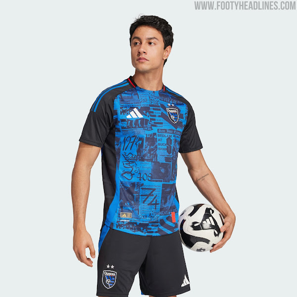 Adidas gives the front of the Adidas San Jose Earthquakes 2025 home jersey a striking design that incorporates handwritten/collage newspaper art, reflecting the DIY spirit of punk rock, the blue-collar makeup of many fans in the Bay Area, and the underground subculture that sparks creativity in the region.