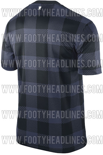 The Manchester United 2013-14 Away Kit features a 'tablecloth' design similar to last season's home shirt and comes in navy/black. A monochromatic white Manchester United crest is used for the Manchester United 2013-14 Away Shirt to better fit the colors.