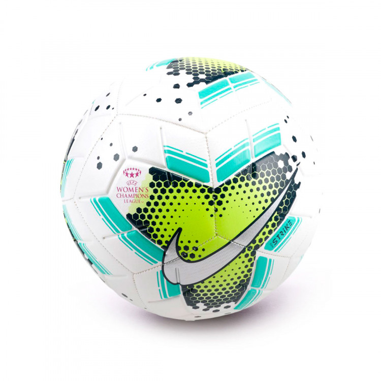 A striking look based on the current Nike ball model, the Nike UEFA Women's Champions League ball combines a white base with Volt (neon), Aurora (turquoise) and Silver applications. The ball comes with the logo of the tournament on the upper.